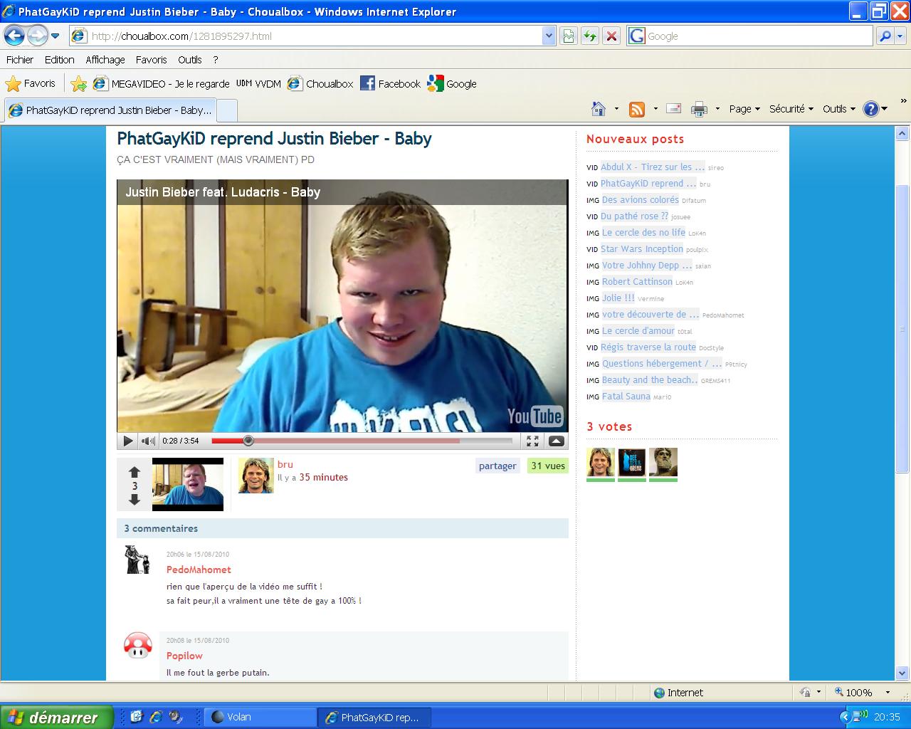 Franchement ça devrait être interdit de laisser des gens comme ça se promener dans la rue de nos jours ! Et faire des videos stupides aussi --" sinon c'est marrant, l'imitation de justin bieber (si c'en est une biensur ou si ce gars est comme ça au naturel xD) est assez bien réussie Mdr.