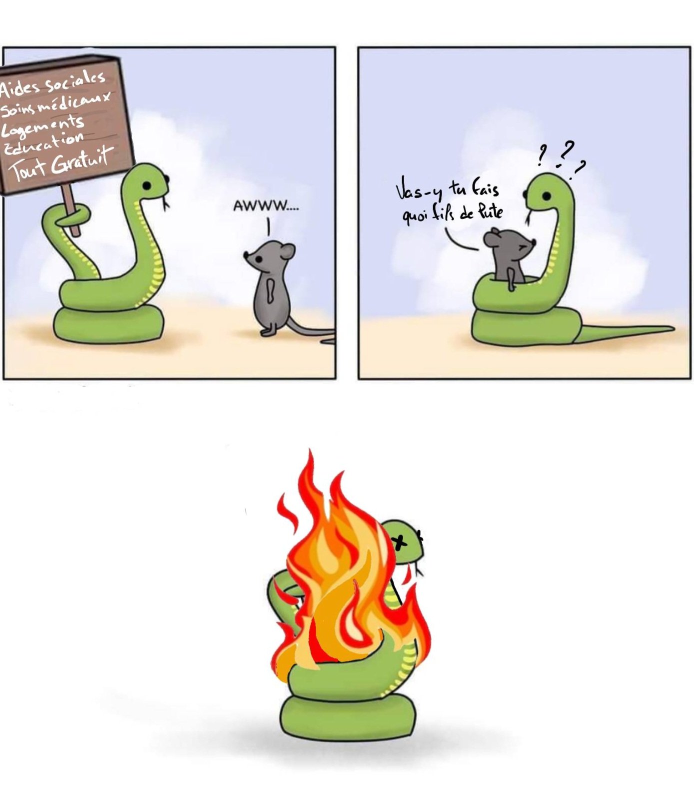 exact, c'est un détournement d'image. Mais pour autant si tu veux y voir une symbolique, la France qui était autre fois crainte et toute puissante, le serpent, s'est adoucie en passant de guerrière à génereuse, et visiblement ça ne lui réussi pas, car les autres ne craignent que la guerre