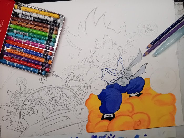 Un p'tit Dragon Ball en cours pour mon fils ! Ces pastels sont trop bien ! Si la photo est à l'envers c'est pas de ma faute.