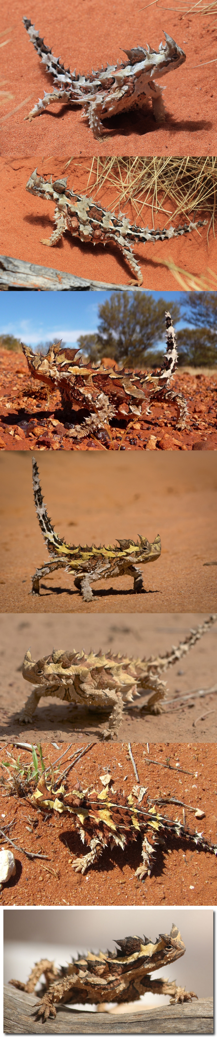 Description : Son corps et sa queue, couverts d’épines, donne une allure terrifiante à ce petit lézard désertique. Cette apparence monstrueuse repousse les prédateurs et lui sert de camouflage. Sa couleur sable ponctuée de rouge et de brun varie suivant le milieu où il évolue. Son régime alimentaire est presque exclusivement constitué de fourmi, c'est un myrmécophage. Il les happe avec sa langue gluante à la sortie de la fourmilière auprès de laquelle il se poste. Un repas ordinaire étant constitué d'à peu près 2000 à 3000 de ces fourmis. Le moloch possède une bosse graisseuse à l’arrière de la tête. Elle lui sert de réserve d’eau pendant les longues sécheresses.