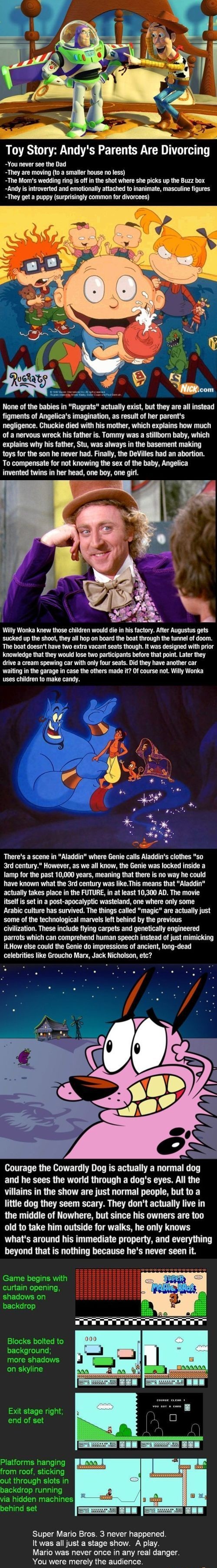 Courage le chien peureux : Tout ce qui se passe sdans le dessin animé n\'est que la vie quotidienne vu par le yeux du chien .Les vilains sont des personnes normales que Courage prends pour des ennemis ,et si il vit au milieur de Nullpart ,c\'est car il ne sait pas ce qu\'il y a en dehors de sa maison ,il pense donc qu\'il n\'y a rien .