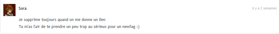 Ah et ce commentaire seul n'aurait probablement pas suffit, c'est l'ensemble de tes commentaires, tes attaques random (dont une que tu as supprimé) et aussi le fait que tu te sois acharné (ce que tu continues de faire d'ailleurs).