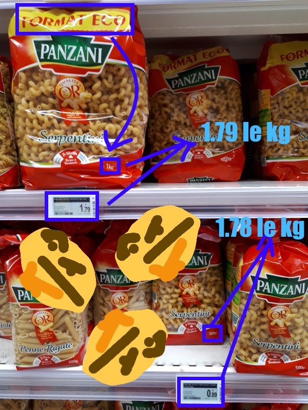 t'es plus con qu'un paquet de pates.... pour 500gr de pates, il y a moins de plastiques que dans 1 paquet d 1 kg... mais avec 2 paquets de 500gr il y en a plus... donc le gramme de plastique coute moins cher que le gramme de pates.....