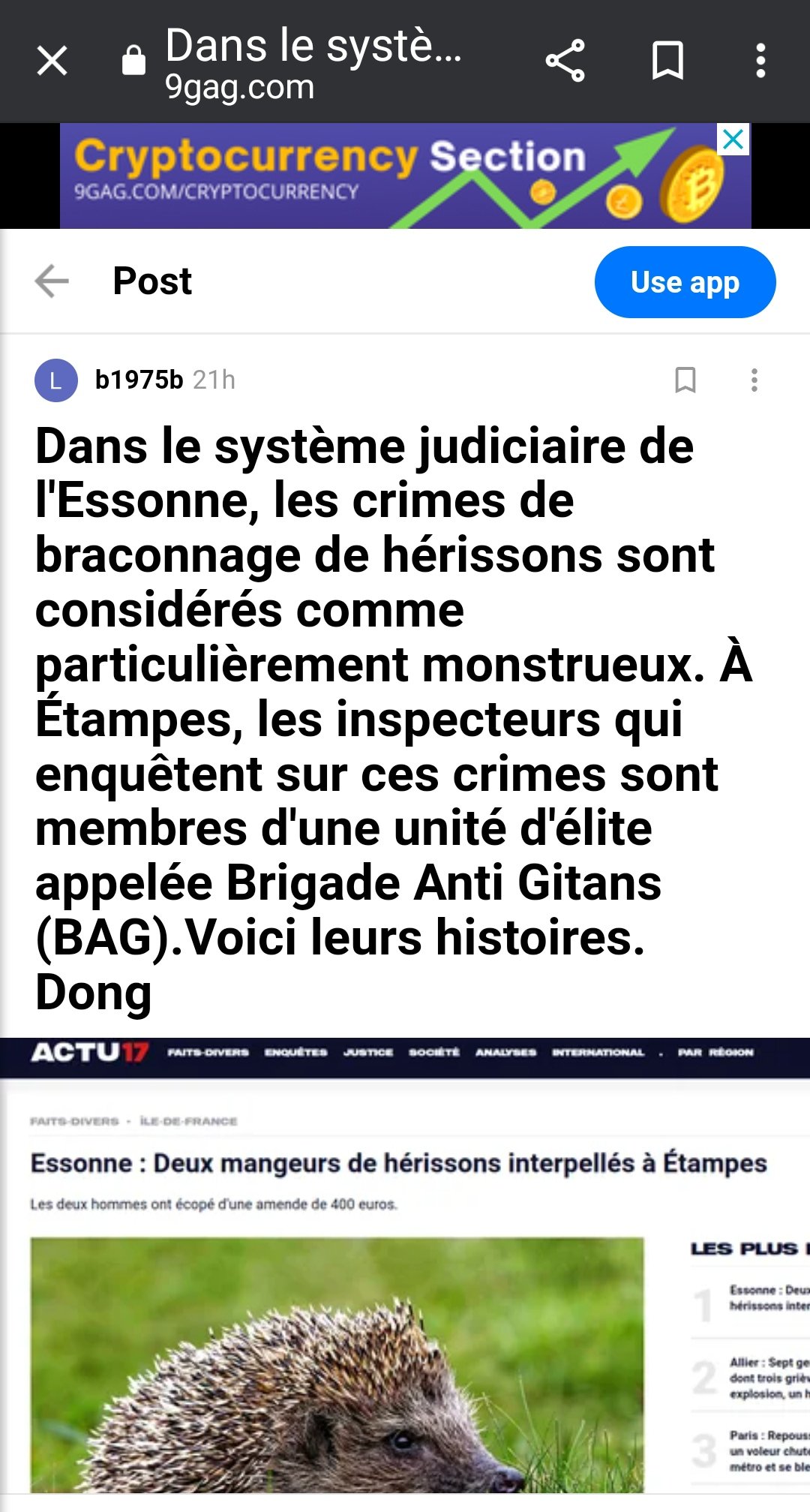 "Dans le système judiciaire de l'Essonne, les crimes de braconnage de hérissons sont considérés comme particulièrement monstrueux. À Étampes, les inspecteurs qui enquêtent sur ces crimes sont membres d'une unité d'élite appelée Brigade Anti Gitans (BAG).Voici leurs histoires "