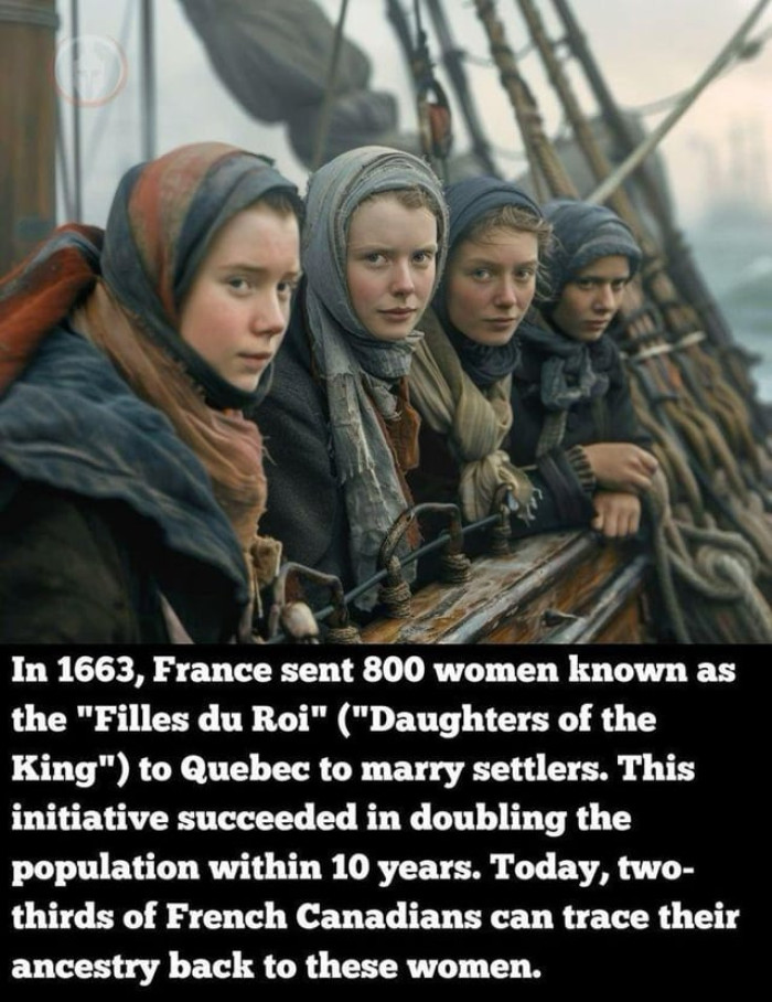 "En 1663, la France envoya 800 femmes, connues sous le nom de « Filles du Roi », au Québec afin d’épouser des colons. Cette initiative permit de doubler la population en l’espace de dix ans. Aujourd’hui, les deux tiers des Canadiens français peuvent retracer leurs origines jusqu’à ces femmes."