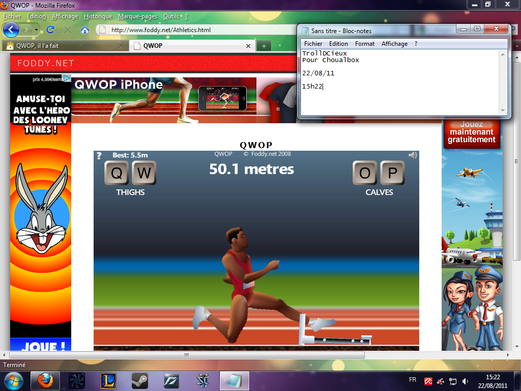 a la limite jmen fou que t\'arrive a faire 100m sur qwop tu veux que je te dise quoi ? GG T UN OUF MEC ON DEVRAIS FAIRE UNE STATUE DE TOI !!!!!