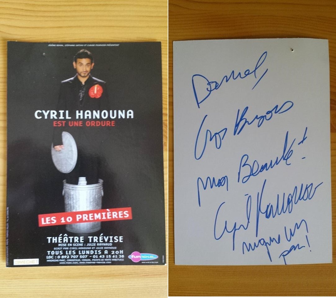 J'fais la queue, à mon tour il me demande mon prénom, si j'ai une copine, je dis non, blabla-bla... Et signe cette vanne en autographe (en com' !)