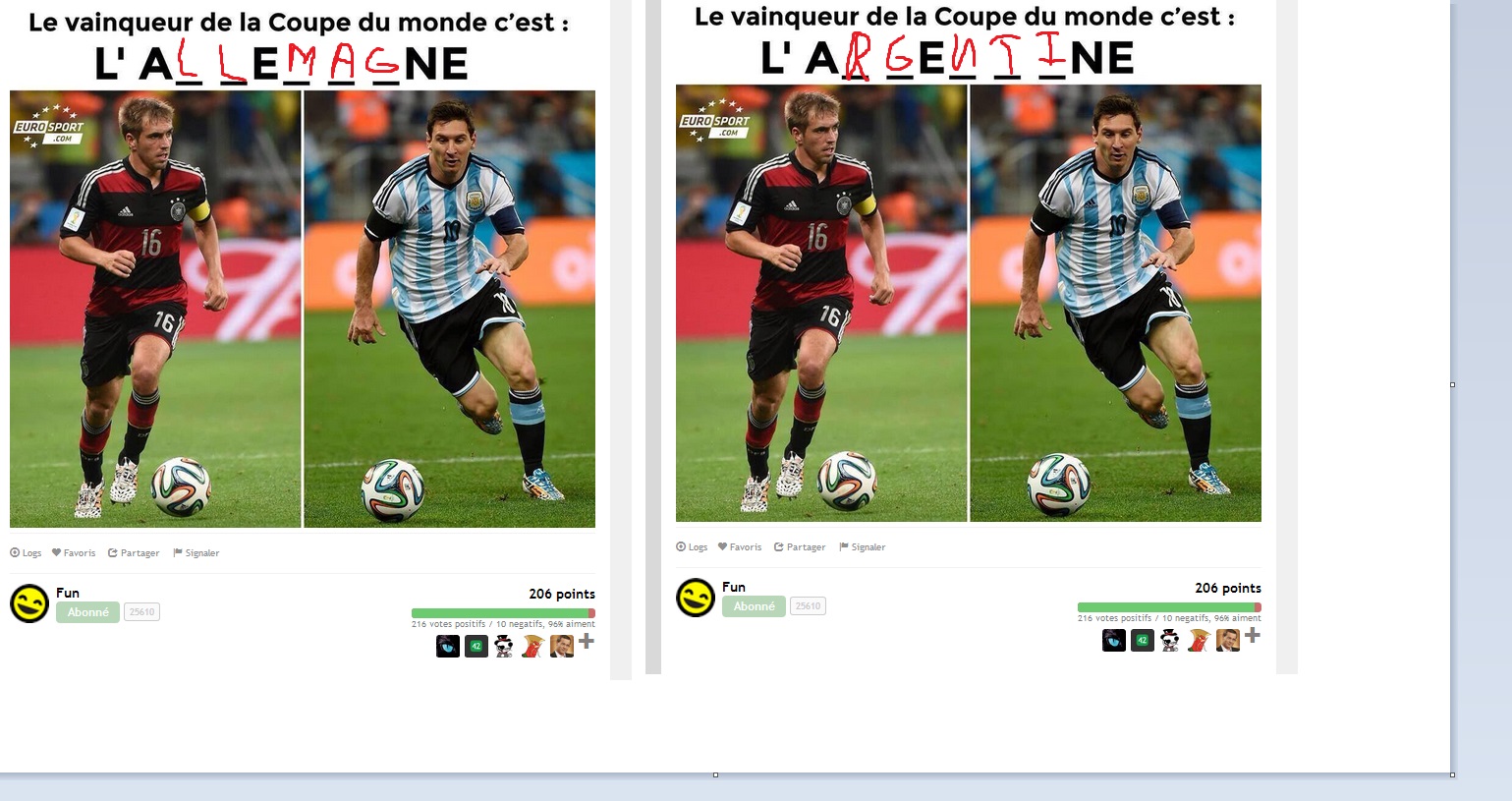 Bon je t' explique. Ci dessus se trouve un mot à trou. Le joueur doit trouver les mot manquant en donnant des lettres. C'est le jeu du " pendu ", car à chaque lettres fausses données, il faut dessiner chaque trait d'une poutrelle pour dessiner un pendu. ( généralement c'est 12 traits, donc 12 fautes ). Là ici, on cherche le vainqueur de la coupe du monde ( aujourd'hui on le sait, mais hier on le savait pas encore ), là il faut trouver l' Allemagne ou l' Argentine. Sauf que les deux rentrent dans les cases, d'où la blague. Je t' ai fait un joli dessin pour une explication plus précise.