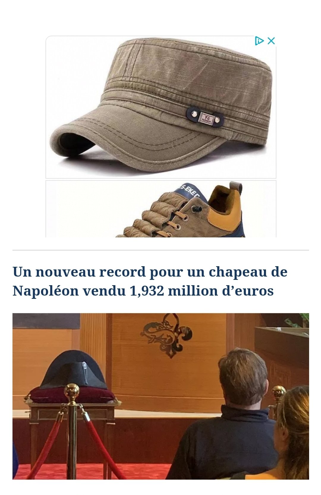 j'aurais tellement aimé etre le type qu'a fait le chapeau, pour recevoir 2m d'euro pour un joli chapeau... ce type dois etre vraiment fier d'être si talentueux pour créé une piece d'exeption. toutes mes felicitations a ce Napoléon !