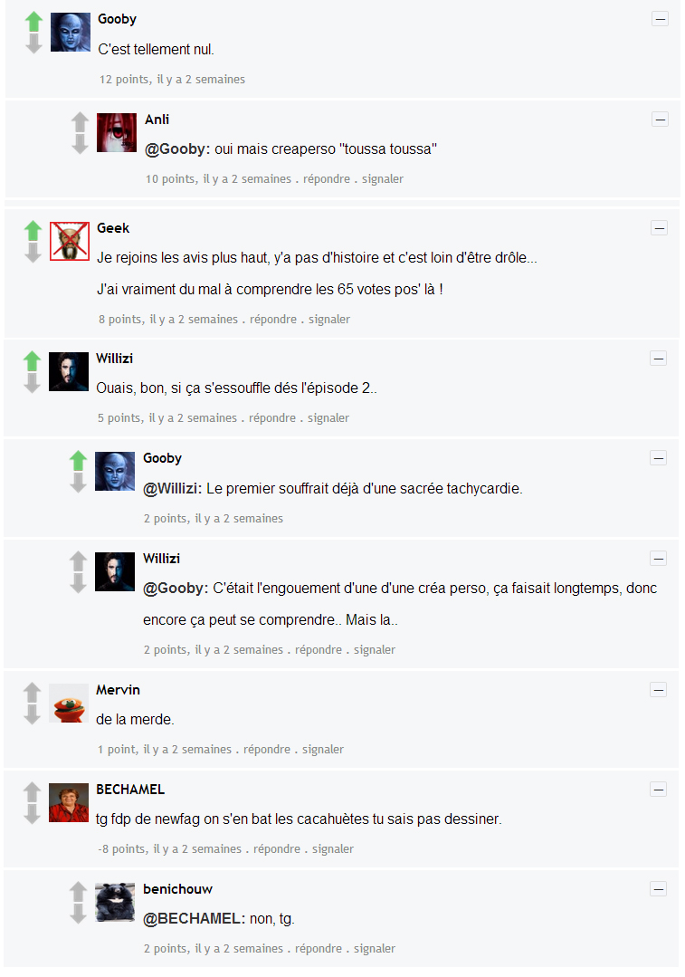 "je n'ai ABSOLUMENT AUCUN COMMENTAIRE CONSTRUCTIF" à chaque créa on te dit que y'a pas de blagues/ pas de chute/ qu'il suffit pas de parler de choualbox pour que ça soit bien, ça veut dire "mets des vraies blagues, un chute et parle d'autre chose que choualbox" (ou fait le de façon drôle au pire) c'est pas compliqué à comprendre pourtant. Tu veux pas qu'on te le fasse à ta place ton comic aussi?