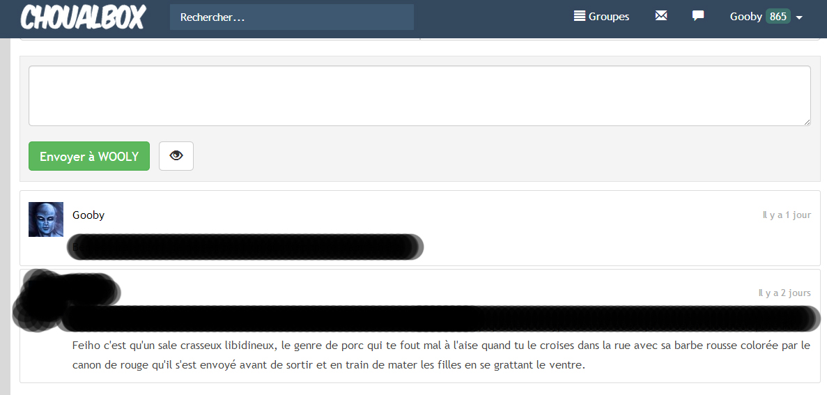 Au début, on parlait de CHOUALBOX, de la merde que ça devient, que ce soit pour ce genre de boxs ou pour les chouineuses comme smocky qui préfèrent alerter le site du moindre remous dans leur vie IRL à coup de box cool-story au lieu de se bouger le cul pour arranger les choses et vous en finissez par des lâches tentatives de clash sur le physique en balançant des photos.