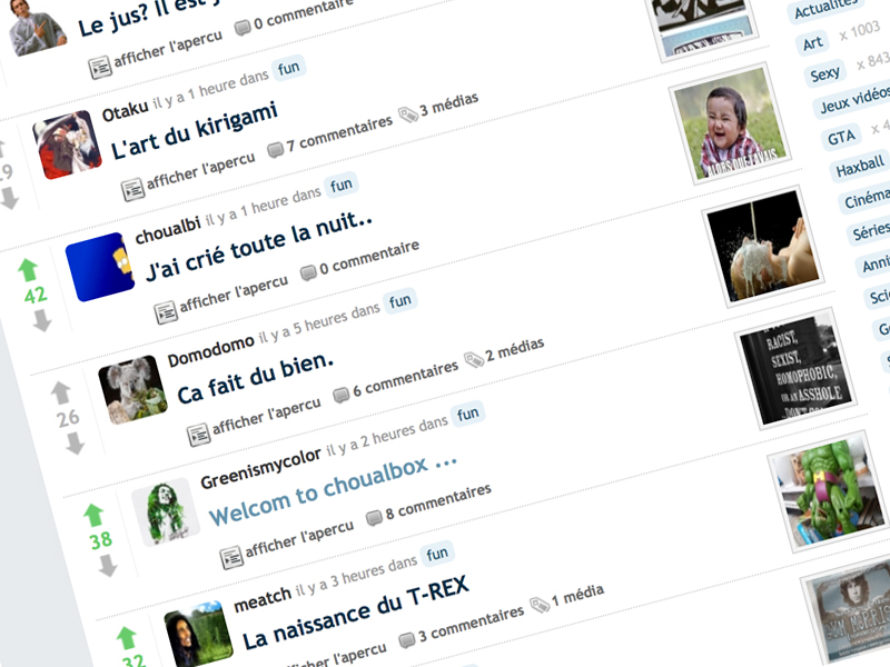 Je préfère personnellement les images des box sur la gauche et les avatars sur la droite.