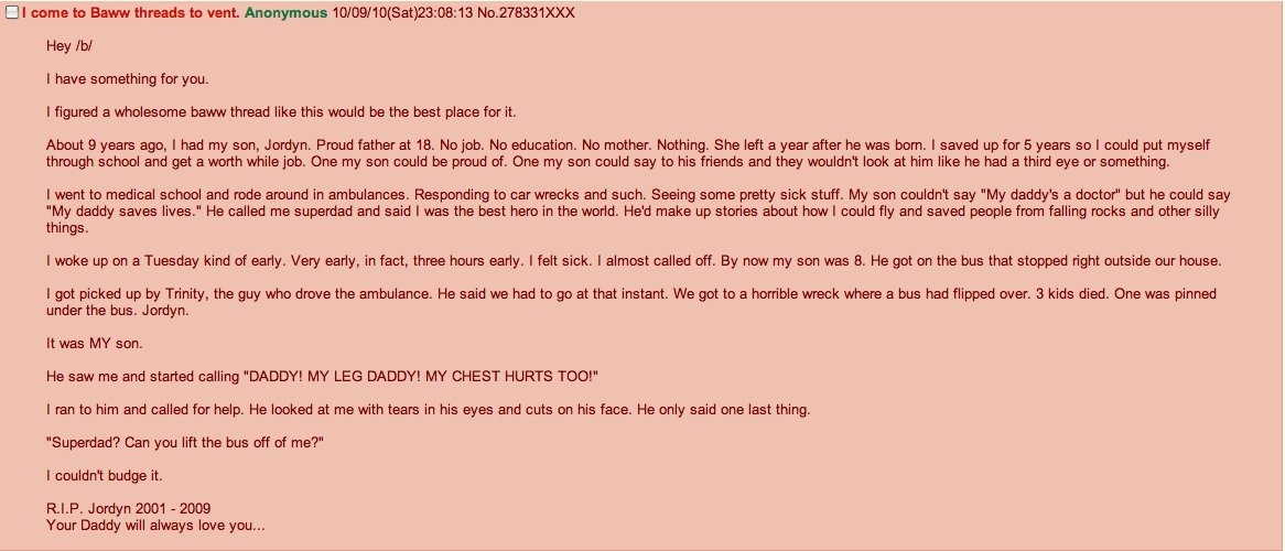 Le type a un fils qu'il élève seul parce que sa SDP s'est tirée après un an, il cherche un job qui rendrait son fils fier. Il devient ambulancier et son fils l'appelle "superpapa" et se fait plein d'histoires héroïques dessus. Un jour il a du aller en urgence sur l'accident d'un car scolaire, 3 enfants morts. Il y en avait un sous le bus, c'était son fils. Il avait plein de larmes dans les yeux et ses derniers mots: "Superpapa, est-ce que tu peux soulever le bus pour moi?" Le père n'a pas su le faire bouger.