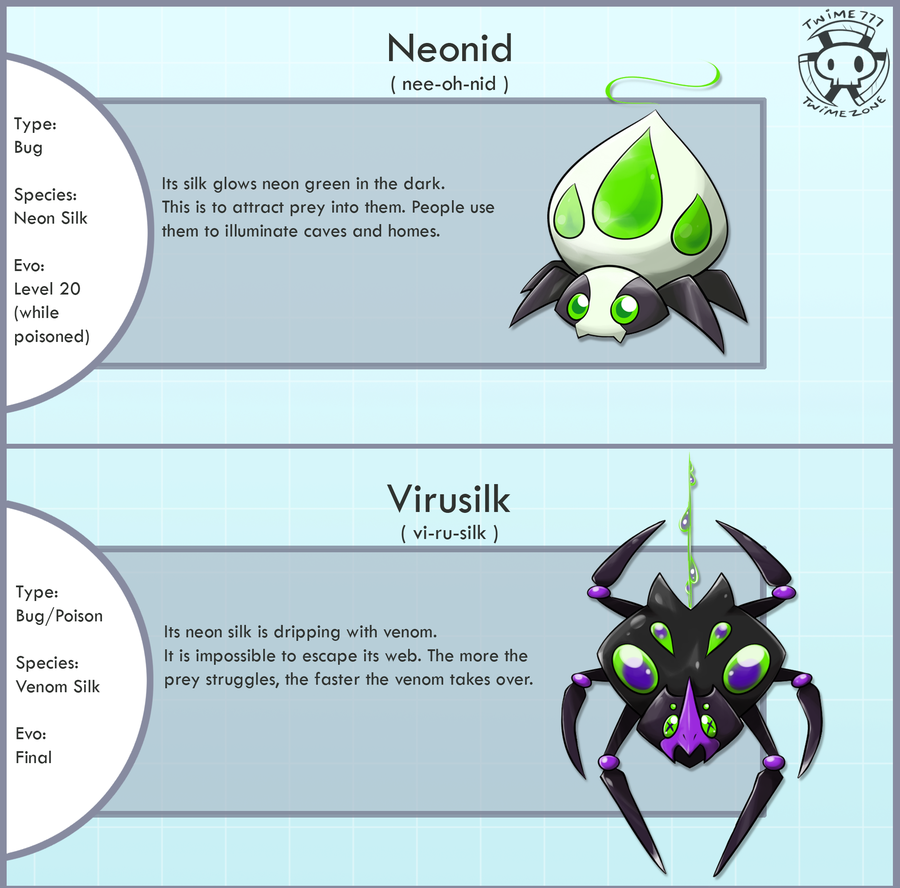 They use their glowing web to help catch prey. The first one is just an ordinary spider but when it evolves (from being poisoned) it becomes more corrupted and sinister looking. The green things on their abdomens are its silk sacks. Virusilk has a skull/face on its abdomen if you look at it upside down.