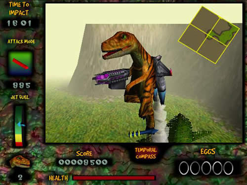 Ba en gros, un meteor va s'ecraser sur la terre, du coup en bon dino du futur, tu viens pour récup' le patrimoine genetique (les oeufs) donc tu dois chopper 6 oeufs et les amener au teleporteur, le tout avec un chrono hyper serré et des velociraptor qui t'enmerde tout du long, j'ai jamais réussi à finir le jeu, les seules fois ou je survivais pas trop mal j'avais time-out...