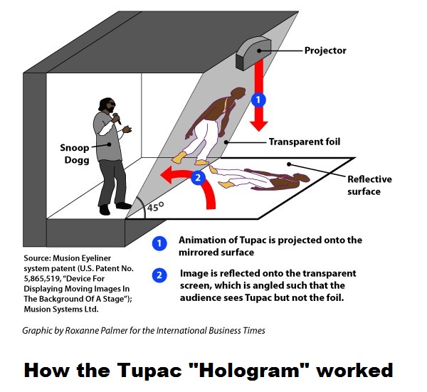 la technique date de bien avant les 4 derniers mois.. check ça : http://gizmodo.com/5902625/tupac-hologram-wasnt-a-hologram et ça : http://gizmodo.com/5902582/tupac-hologram-creator-reveals-how-he-resurrected-the-rapper