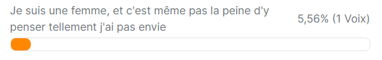 L'idée est d'avoir une idée de la misère au niveau de Choualbox pour les mamanchouals et papachouals. Je vous demande de jouer un minimum le jeu et de pas troll. Je pense vraiment qu'il y a un vrai problème de société autour de la sexualité après le premier enfant. Votr eavis m'ssieurs dames!