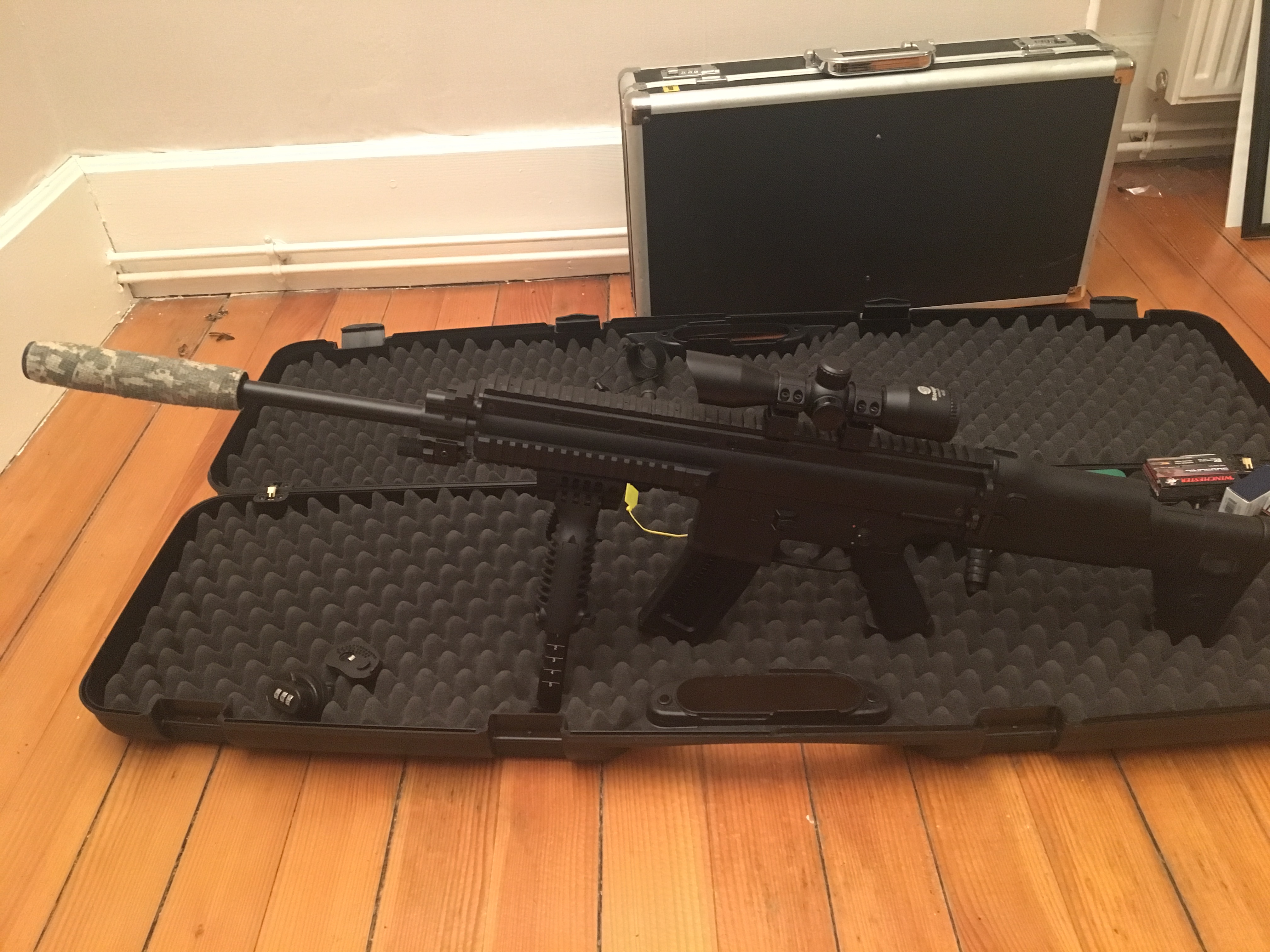 J'avais prévu il y a quelques années, de refaire une box à propos de ma carabine après l'avoir équipée . Mais je me suis rendu compte que je ne l'avais pas fait. Du coup je vous la représente, avec maintenant une poignée garde main qui fait bipied, une lunette 4x32 un pointeur laser et un réducteur de son.