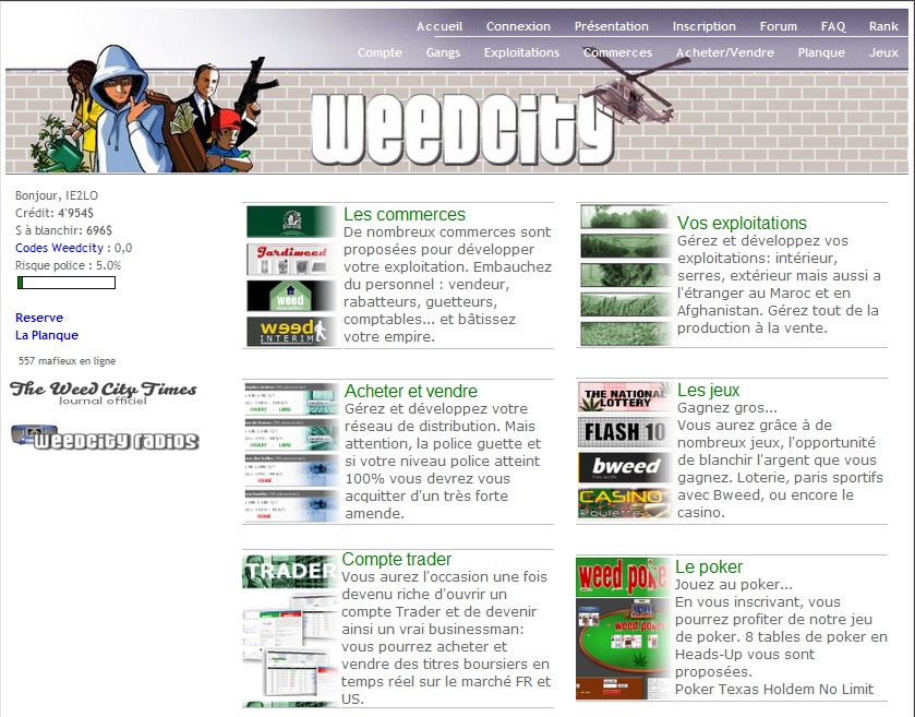 Jeu tres impressionant par sa grandeur avec des modules inclus dans le jeu : Avec la communauté Weedbook, de quoi faire du trade (investis et achete en bourse), des paris sportifs, un casino ou on peut jouer au poker, jeux de grattage, loterie etc..