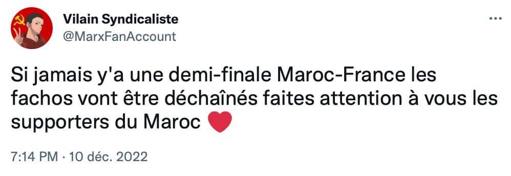 Qu'ils gagnent ou qu'ils perdent les marocains vont faire comme à chaque match, foutre le zbeul, ça sera juste plus violent. En plus ils ont, exceptionnellement, l'affection des algériens et autres maghrébins, les crs vont se faire plaisir.