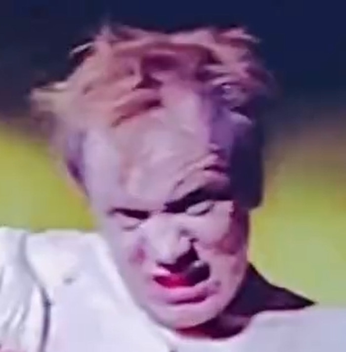 a man in a leather jacket is standing in front of a blue background that says euuuuh