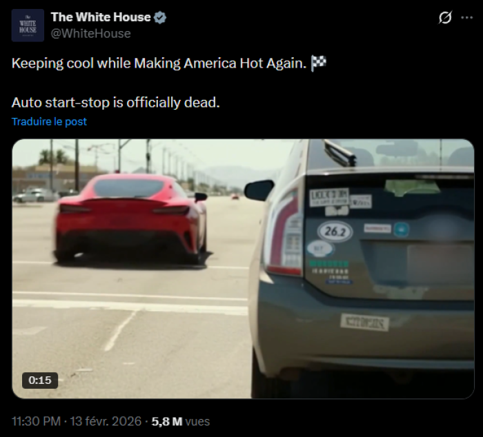 Ceci est un "message" officiel de la Maison Blanche à propos de l'abandon du Start & Stop et plus généralement, de l'annulation des normes démissions des véhicules.