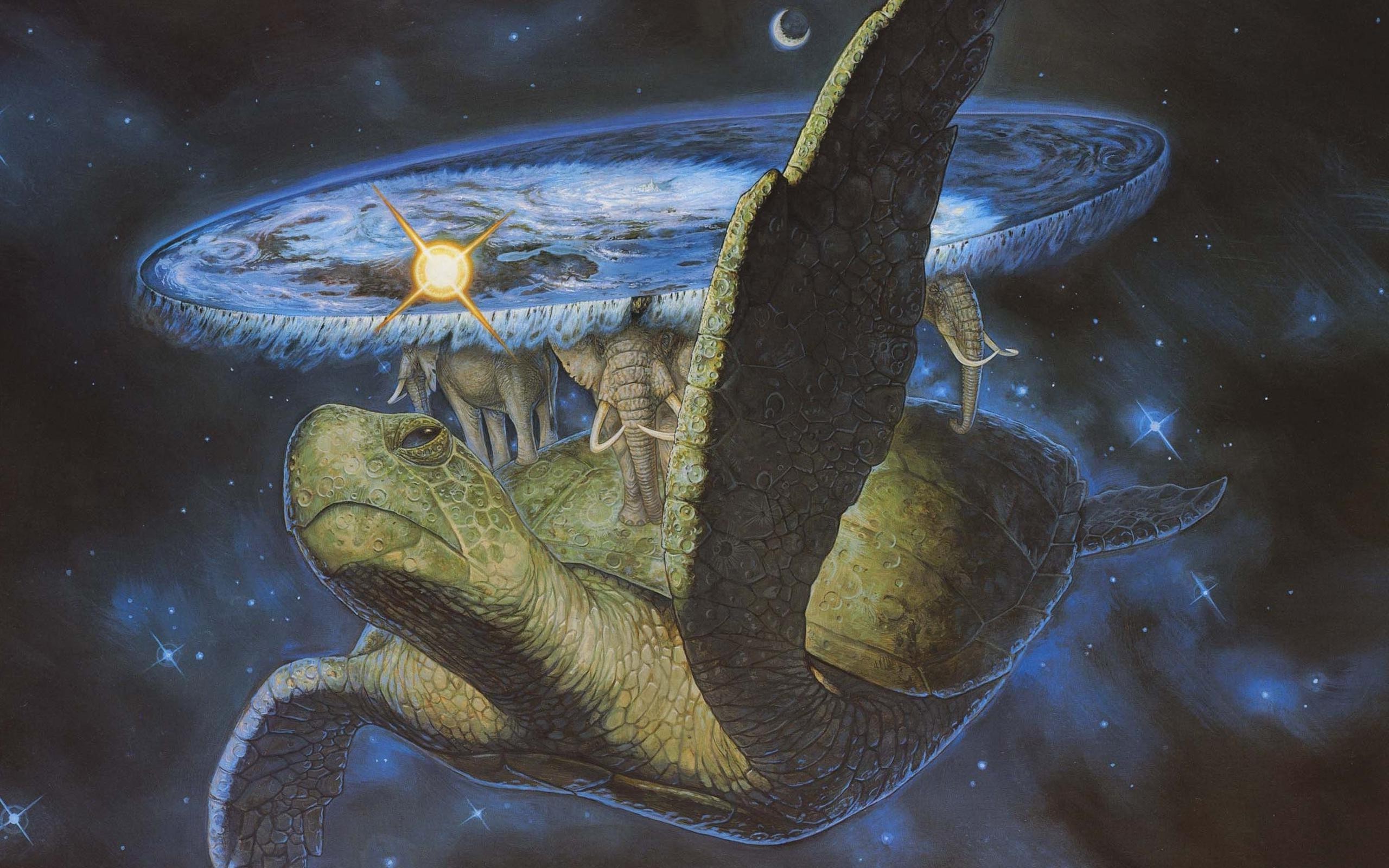 Dans la cosmogonie chinoise, le monde est porté par quatre éléphants, eux-mêmes soutenus par une tortue. Cette vision du monde vient tout droit de l’Inde. Pour les hindous la création du monde revient au dieu Brahmâ. Un énorme serpent se mordant la queue est suspendu dans le vide de l’infini, symbolisant la course éternelle du Soleil dans le ciel. Sur ce serpent repose une tortue. Sur cette tortue se trouvent des éléphants qui portent les trois mondes. Le monde inférieur des démons et de l’enfer, le monde intermédiaire des hommes et de la Terre, et le monde supérieur des dieux et de la félicité.