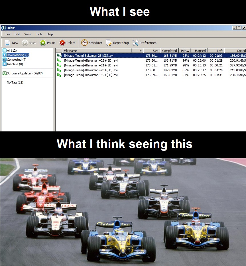 5 fichiers de tailles similaires (5 F1) qui dl en même temps (une course) qui arrivera le 1er? enfin c\'est ce que j\'ai compris