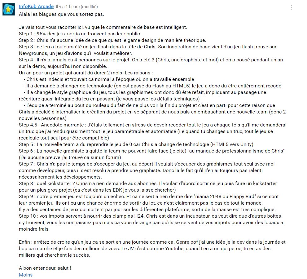 C'est pas parce-qu'il est connu et que son jeu pue la merde qu'on lui chie dessus. Ok steam est remplie d'étron similaires à fuzecats, mais combien de ces étrons résultent d'un kickstarter et de subventions ? Faut pas oublier qu'ils avaient un budget très confortable pour un simple jeu flash. Pense aux mecs qui ont soutenus son kickstarter et aux grenoblois qui voient leurs impôts finir là dedans.