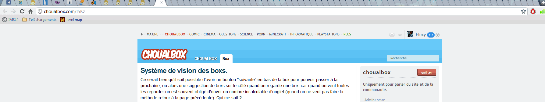 J\'apprécie les suggestions mais en ce moment ya vraiment plus urgent (des bugs, des problèmes de lenteur) que de rajouter des \"fonctions\". Pour la plupart des gens le site est déjà très compliqué, si j\'écoutais tout le monde Choualbox ressemblerai à rien...