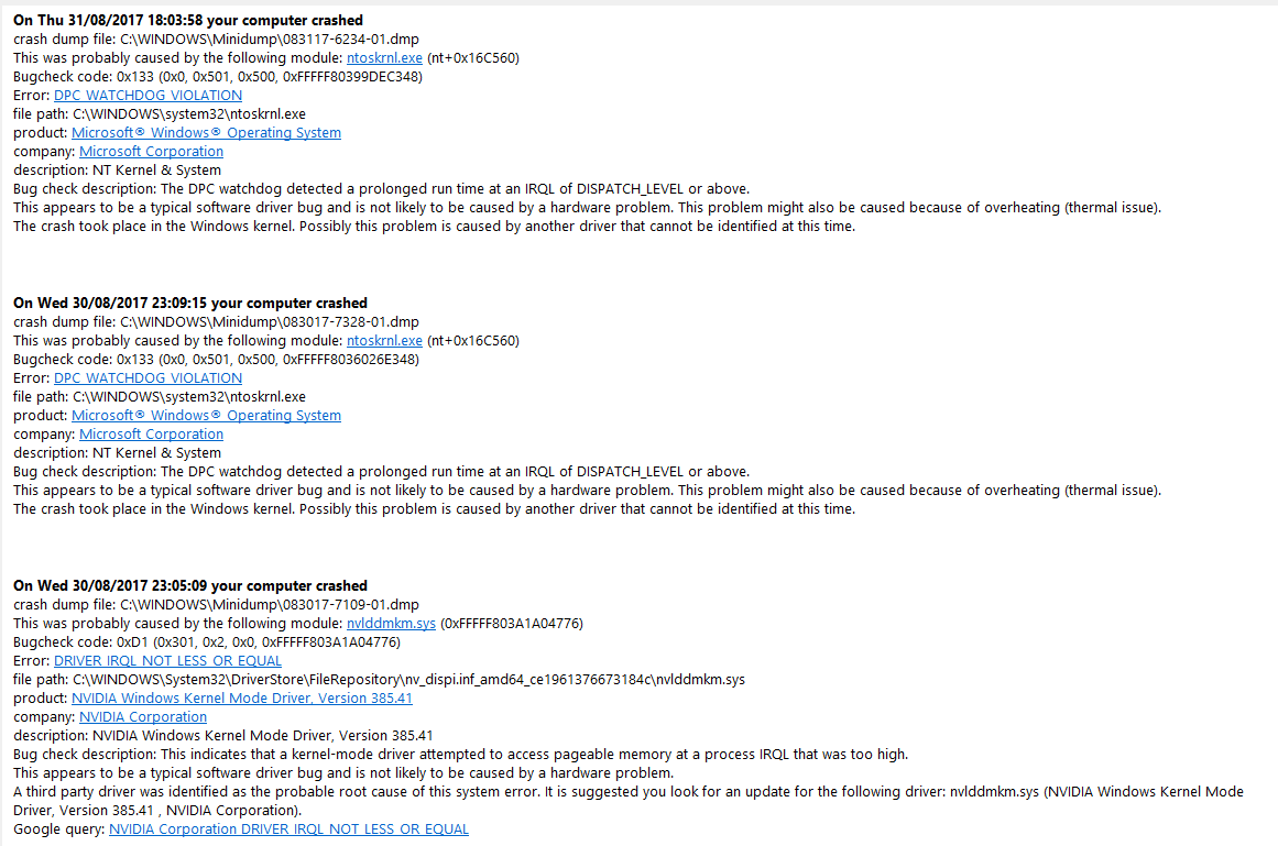 C'est chelou car ça me dit que c'est surement un problème de driver ou de température alors que les températures sont normales et j'avais pas update que que ce soit avant que ça crash. J'ai juste fait la MàJ Geforce Game Ready Driver version 385.41 après que les problèmes commencent mais ça à rien arrangé ni dégradé, c'était pareil.