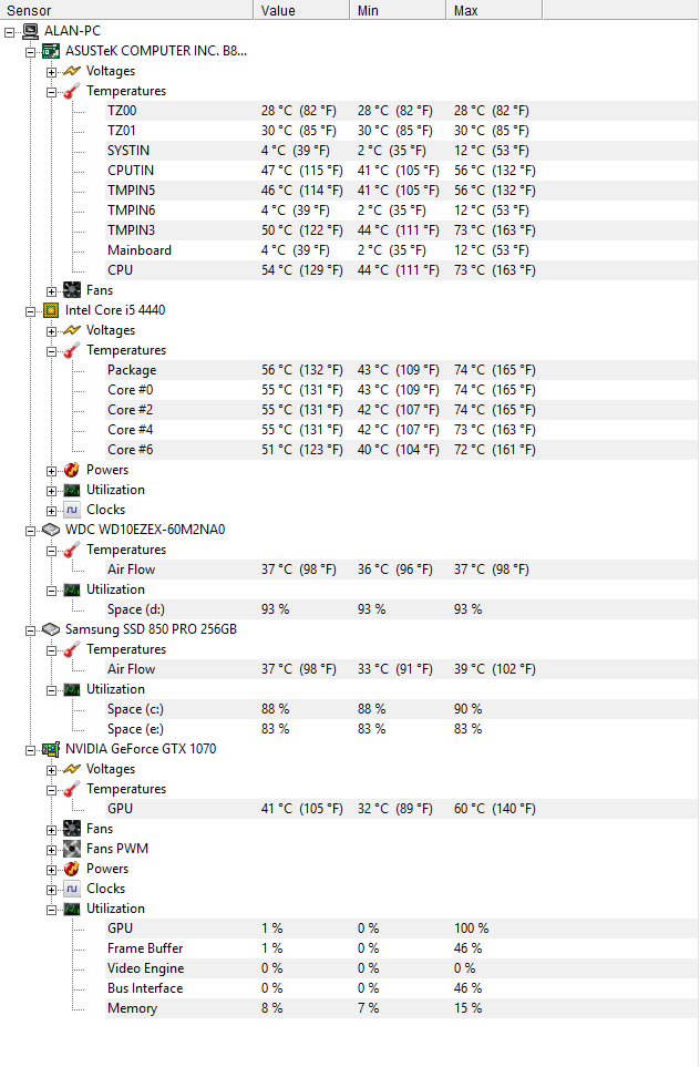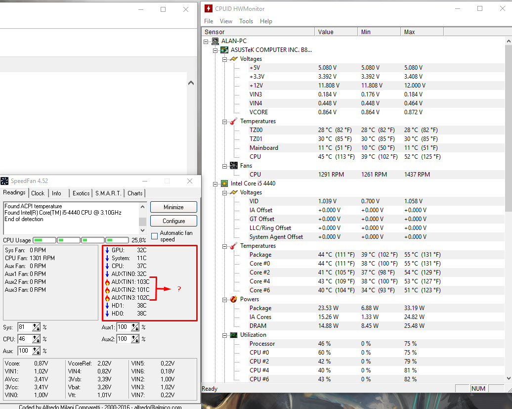 Par contre pour les temperatures j'utilise CPUID HWMonitor et SpeedFan, or sur SpeedFan il y a 3 temperatures qui sont genre élevé mais fixe mais je ne sais pas du tout à quoi elle correspondent.
