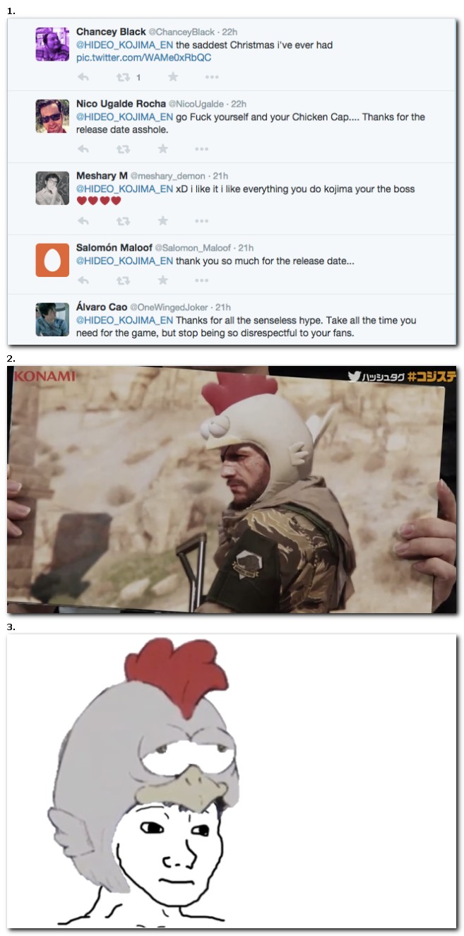 Le jour de Noel (heure américaine), des milliers de fans (dont moi) visionnions le direct du ''Kojima Live Station'', ou pendant trois heures Kojima va un peu parler de MGS5 (surtout de Ground Zero..), il promet qu'il y aura une grosse surprise pour MGS5 à la fin du live. Et c'est là qu'à 02:44:00, Kojima-san sort une photo de.... Big Boss portant un chapeau de poulet...