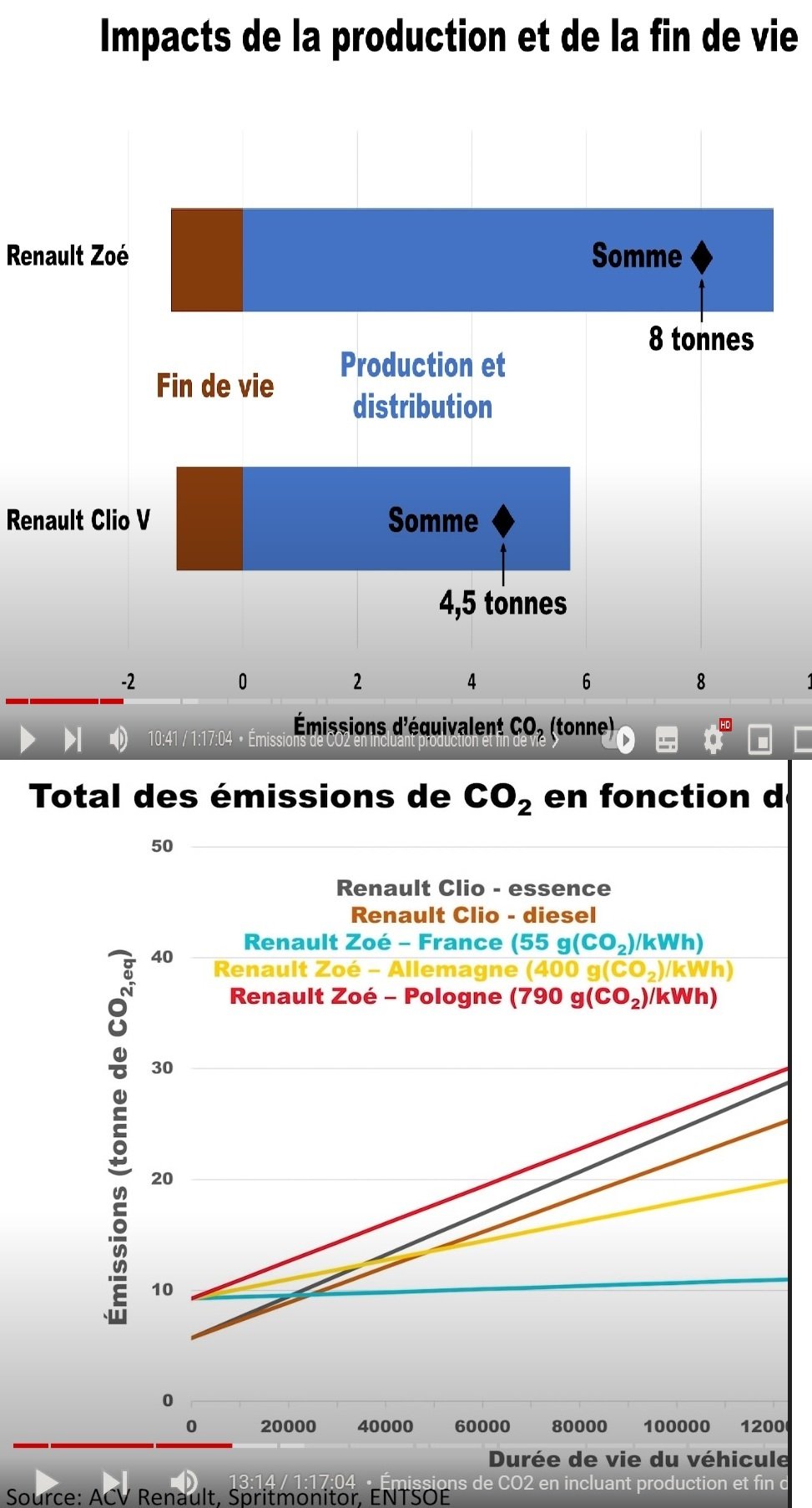 Il dit qu'une Zoé c'est 1.5t et qu'elle produit 8t de carbone par tonne à la construction, ce qui donne donc 12t et non un peu moins de 10t comme il le montre.