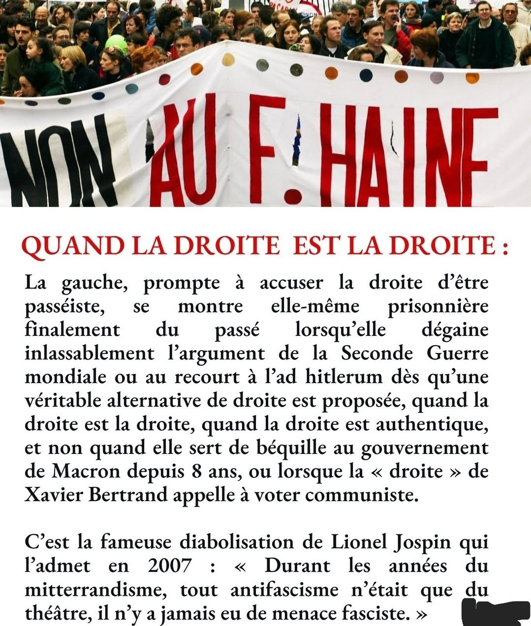 Et encore ce n'est qu'un exemple, Mitterand ou encore le RPR de Chirac avaient des propos et positions bien pire que ce que les actuels "fascistes" proposent aujourd'hui.