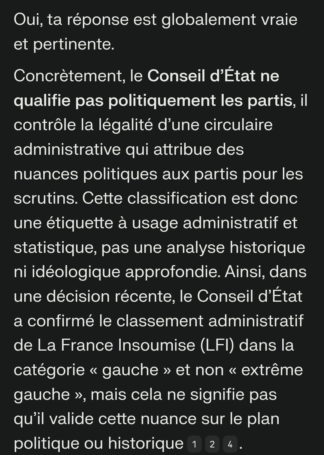 En gros des qualifications qui servent à des fins juridiques, relevant principalement de la logistique des scrutins ou de conditions procédurales (dépôt de listes, diffusion des parrainages, etc.). Elles ne correspondent en aucun cas à une analyse idéologique, historique ou stratégique approfondie.