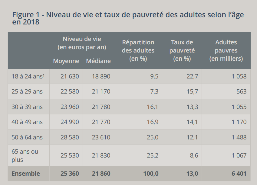<65 ans et plus> est la tranche dont le taux de pauvreté est le plus faible.
