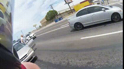 En Arizona, un automobiliste ne va pas apprécier de se faire couper la route par un motard. A un feu rouge, il va descendre de sa voiture pour avoir une petite explication avec le motard.