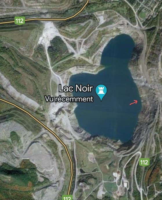 Pour rajouter quelques infos, il s agit de l'ancienne route 112 au Québec, entre Thetford Mines et Saint-Joseph-de-Coleraine, longeant par l'Est le Lac Noir (fleche rouge). Elle est dans cet état depuis un glissement de terrain en 2009 (la vidéo est de 2022 je crois). Vu l'étendu des dégâts, il a été plus simple d en reconstruire une côté ouest et ne longeant pas le côté le plus abrupte de l'ancienne mine. Car oui, le lac noir n'est pas naturel mais a été créé dans une ancienne mine d'amiante.