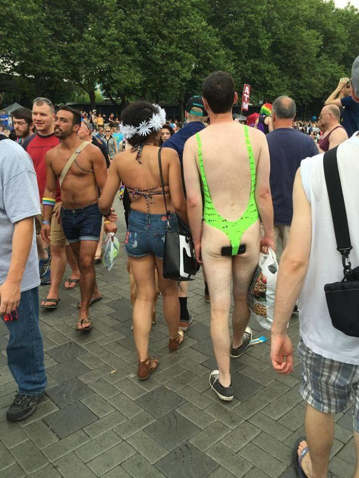 a man without a shirt is wearing a green thong and giving a middle finger .