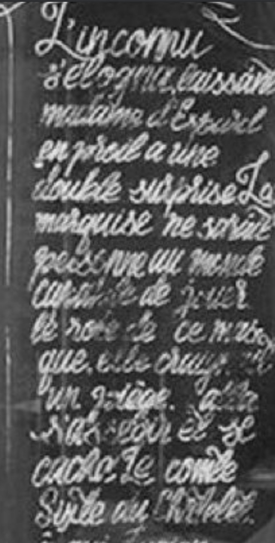 C'est illisible avec la pixellisation en effet mais après avoir pris 2 minutes pour décrypter une partie, j'ai trouvé d'où venait le texte, c'est de Honoré de Balzac "Splendeurs et misères des courtisanes" : "L’inconnu s’éloigna, laissant madame d’Espard en proie à une double surprise. La marquise ne savait personne au monde capable de jouer le rôle de ce masque, elle craignait un piège, alla s’asseoir et se cacha. Le comte Sixte du Châtelet, à qui Lucien avait retranché son du ambitieux avec une affectation qui sentait une vengeance longtemps [rêvée, suivit à distance ce merveilleux dandy, et rencontra bientôt un jeune homme auquel il crut pouvoir parler à cœur ouvert.]"