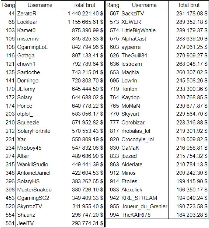 A noter que c'est le total brut et qu'en France il me semble que les impôts sur les subs / don c'est 55%. C'est ce que j'ai entendu du coté de Wankil, si quelqu'un est plus calé que moi sur le sujet hésitez pas à me corriger.