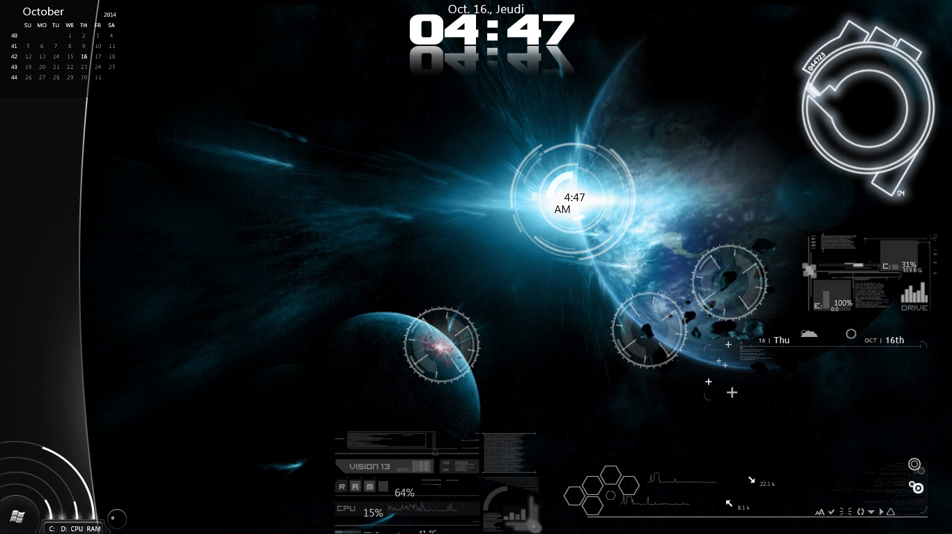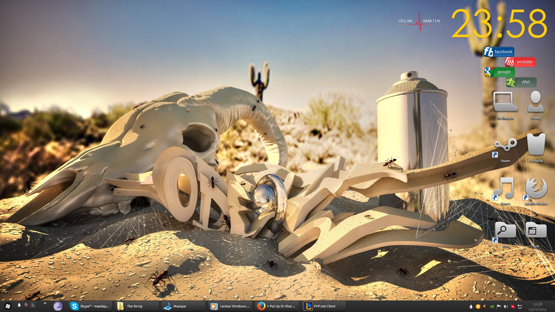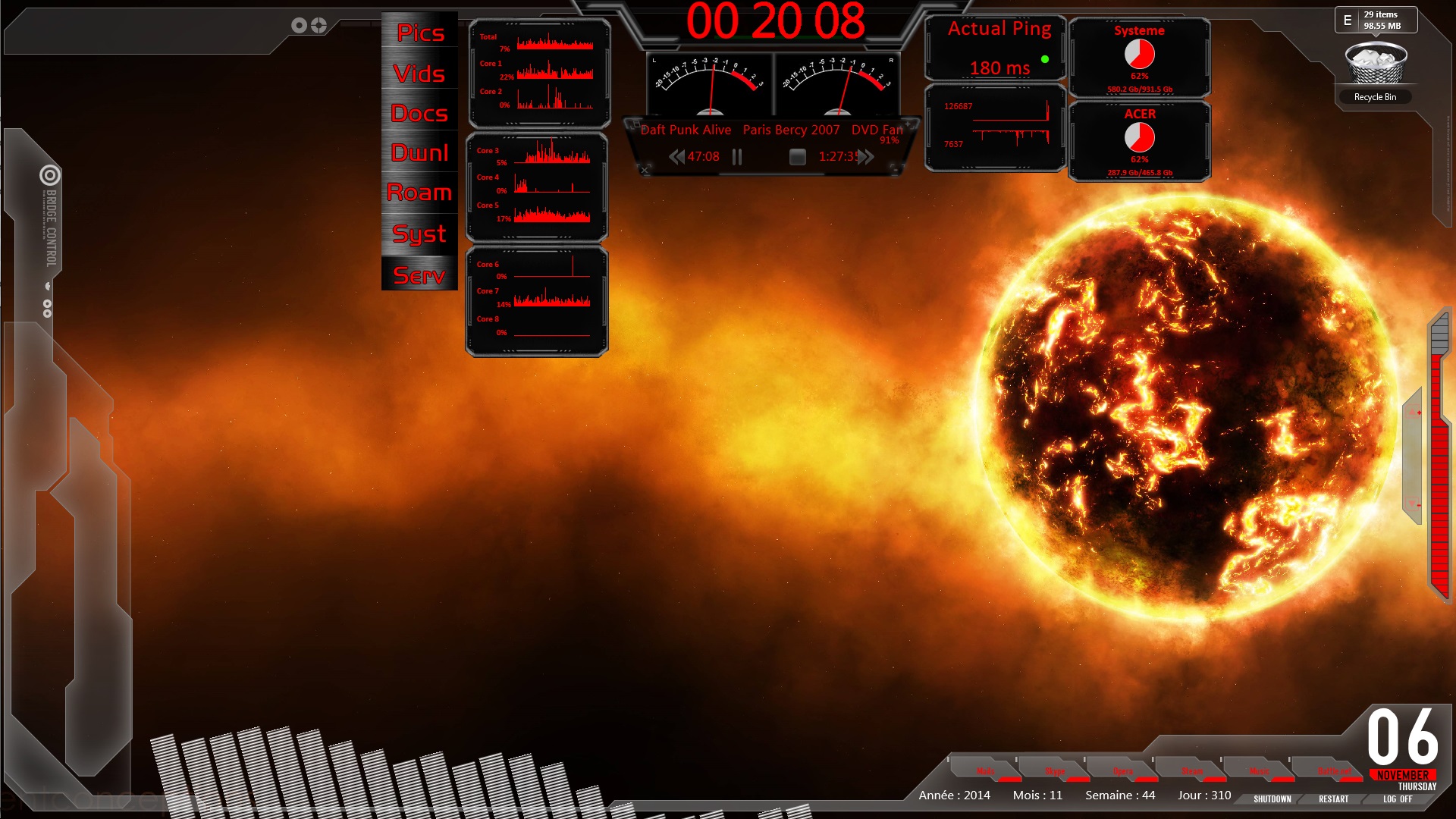 J'me faisait chier donc j'ai décidé de me mettre sur rainmeter j'ai rajouter quelques truc et je comptes en rajouter plus tard, mais pour l'instant je trouve ça sympa, j'ai refait quelques icones, comme DayZ, Wow, et steam. au faite si quelqu'un sait comment fusionner Rocketdock et la barre de menus ou tout simplement changer la barre de menus pour avoir le démarrer, je veux bien de l'aide, merci.