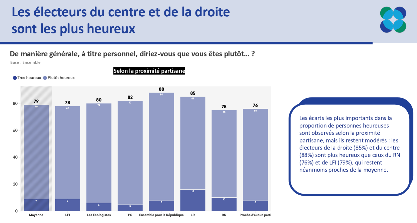 «Pas d’écarts majeurs non plus selon les électorats : si les sympathisants de droite et du centre se disent encore plus heureux (88% Ensemble pour la République, 85% LR), ceux du RN (75%) et de LFI (78%) sont à peu près aussi heureux que la moyenne des Français. »