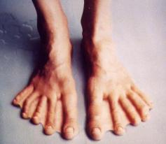 Aujourd'hui en biologie cellulaire on étudie les pieds à Poches. Visiblement il a une mutation qui fait que quand il n'était encore qu'un pauvre fœtus, les palmes entre ses doigts de pieds qui sont censés disparaître ne se sont pas supprimés entre deux de ses orteils.