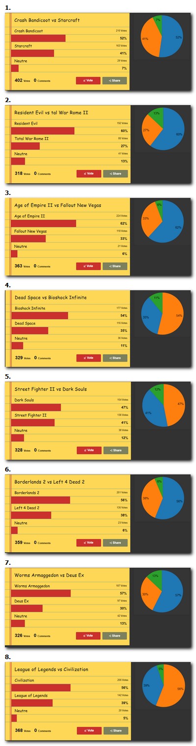 Et voilà, les premiers jugements sont tombés, et les sel a coulé. Ainsi Starcraft s'est fait pulvérisé, La décadence de Total War Rome II a causé sa perte, Fallout New Vegas s'est fait atomisé, Dead Space a été envoyé en orbite, Street Fighter II est KO , Left for Dead 2 est mort pour de bon, s'est fait capitaliser et League of Legend a été banni (probablement pour toxicité).