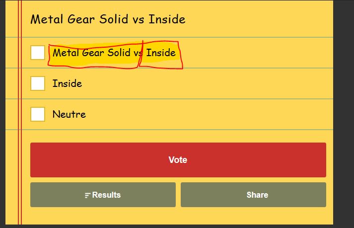 Metal Gear Solid vs Inside : https://www.strawpoll.me/16470122