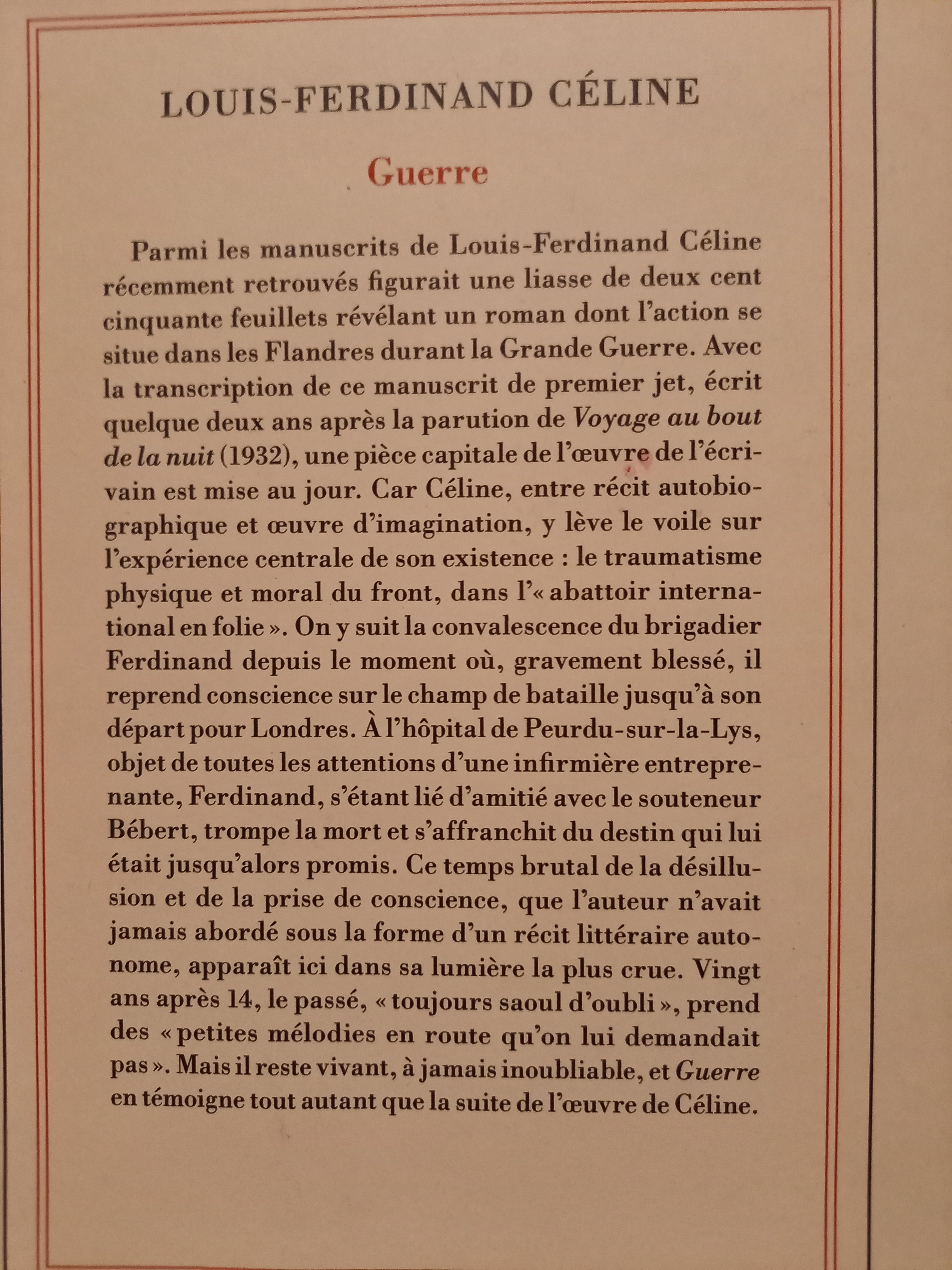 Bon, j'ai pratiquement terminé. Que dire sauf que c'est du Céline. Un soldat gravement blessé se remet de sa convalescence animé par la haine et le dégoût de l'autre, voir l'humanité. Des personnages formidablement laids, méchants, pathétiques, il ne s'épargne pas lui-même. Son style et sa manière..