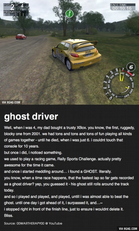 En gros, un gars jouais a un jeux de rallye avec son père quand il avait 4 ans. Son père est décédé quand il a eu 6 ans, et pendant 10 ans il n'a jamais rejoué a la XBox car il avait passé trop de bon moment dessus avec son père. Là il a rejoué a ce jeux de rallye et s'est rendu compte qu'il y avait un ghost (fantôme) chrono au nom de son père sur un des circuit. A force de jouer, il a réussis a le battre, mais pour pas effacer le fantôme de son défunt père, il s'est arrêté devant la ligne d'arrivé. Et c'est ça qui est beau.