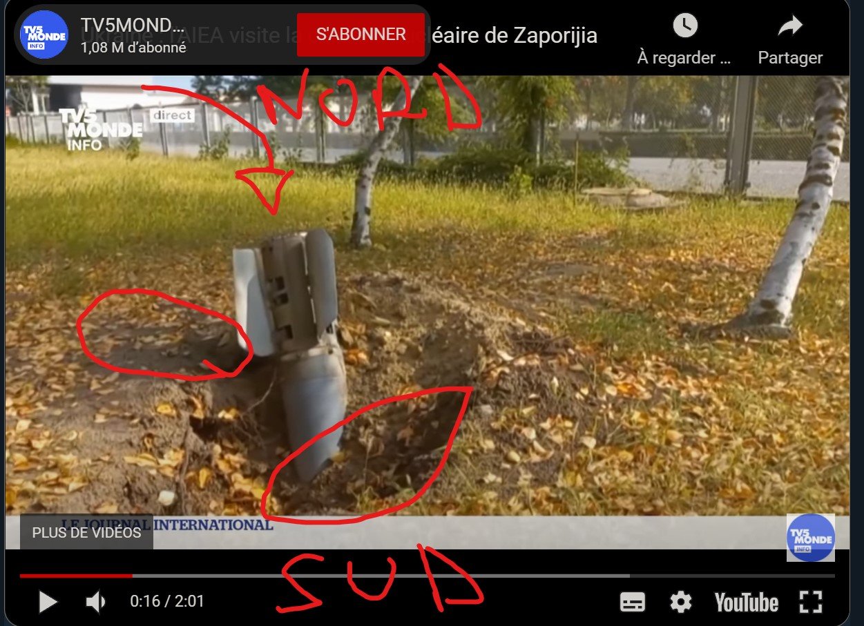Ensuite, malgré ta démonstration brillante, si cette roquette vient du nord, pourquoi le russe dans la vidéo insiste sur le fait qu'elle a pivoter dans son trou d'impact. Car, si tu as raison et que le camp russe dit la vérité sur le pivotement, dans ce cas elle vient bien du sud. CQFD.